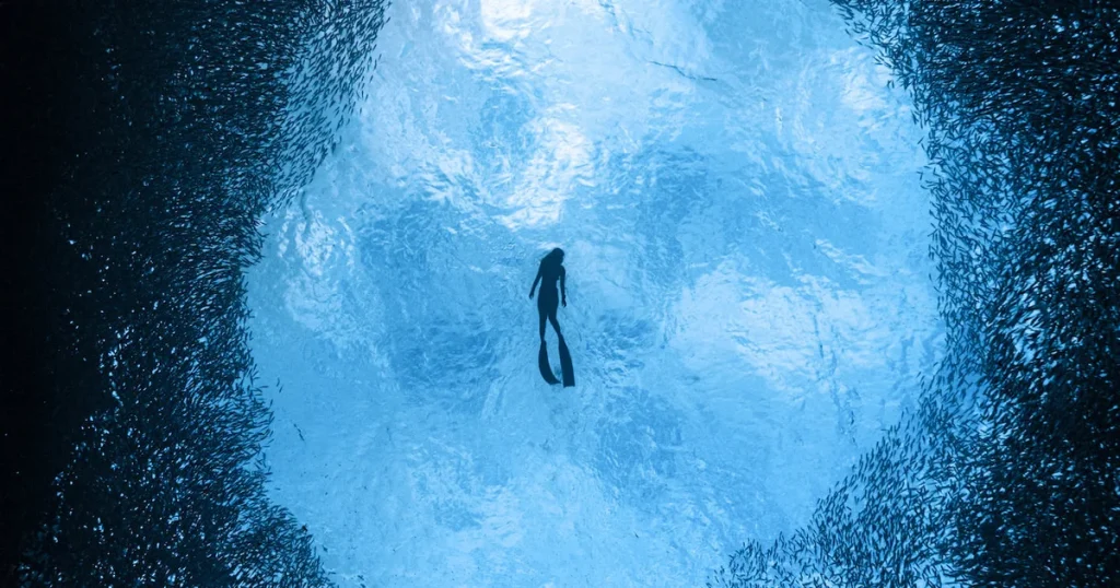 Đây là một trong những bức ảnh đẹp nhất của năm 2024. Nhiếp ảnh gia người Chile Benjamin Yavar đã chụp được khoảnh khắc kì diệu này dưới đáy sâu Cebu, Philippines, khi một nữ thợ lặn đang bơi vào giữa một đàn cá hàng vạn con, mà sự di chuyển xoáy của chúng tạo thành một vòng tròn lớn. Một khoảnh khắc tuyệt đẹp không chỉ nhấn mạnh đến những chuyển động của người lặn và đàn cá, tạo nên sự cảm nhận về sức mạnh và năng lượng lớn lao dưới đáy đáy sâu mà còn nêu bật mối tương tác giữa con người và đại dương.